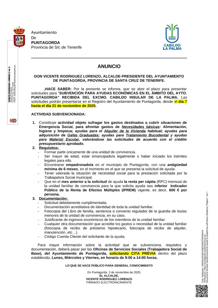AYUDAS ECONÓMICAS PARA ATENDER SITUACIONES DE EMERGENCIA SOCIAL EN EL AYUNTAMIENTO DE PUNTAGORDA